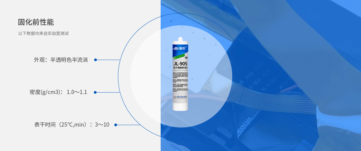 JL-905電子密封膠是一種可進行快速粘接的有機硅膠粘劑,半透明膏狀,絕緣性優、粘接性好,防潮、抗震、耐電暈、抗漏電。膠料對金屬和大多數塑料的粘接性良好,固化后具有卓越的抗冷熱交變性能(-60~250℃),符合國際環保標準,已通過歐盟ROHS標準和SGS檢測。